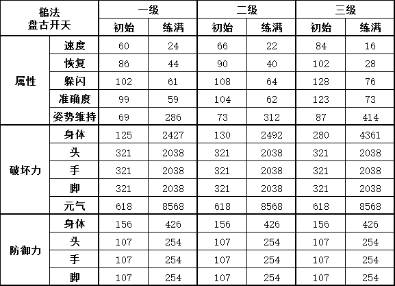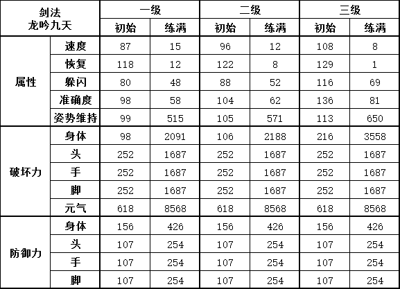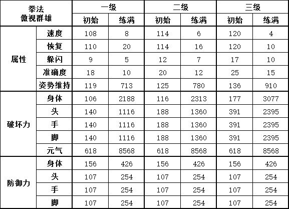拳法--傲视群雄,剑法--龙吟九天,刀法--傲寒六诀,枪法--大漠孤烟,槌法--盘古开天